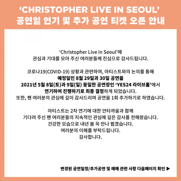 [‘Christopher Live in Seoul’ Rescheduled & Additional Dates]